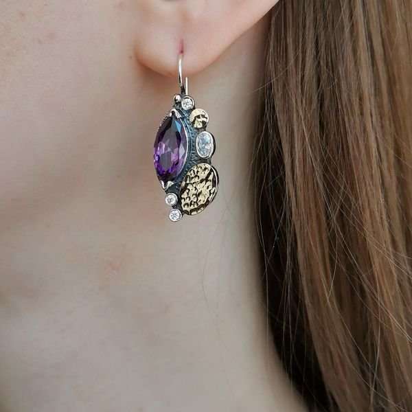 Серьги из серебра 925 пробы, вставки: золотая пластина, аметист, куб.циркон. Размер вставок: аметист 15х7 мм, куб.циркон 5х3 мм, 3 мм. Длина серег с дужкой 35 мм. Размер художественного элемента 25х15 мм. Средний вес изделия 10,5 гр. Производство Израиль.