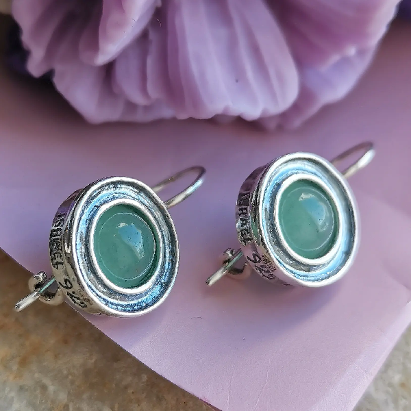 Серьги из серебра 925 пробы, вставка авантюрин. Диаметр вставки 8 мм., диаметр художественной части 13 мм. Длина серег с дужкой 25мм. Средний вес изделия 5,7 гр. Производство Израиль.