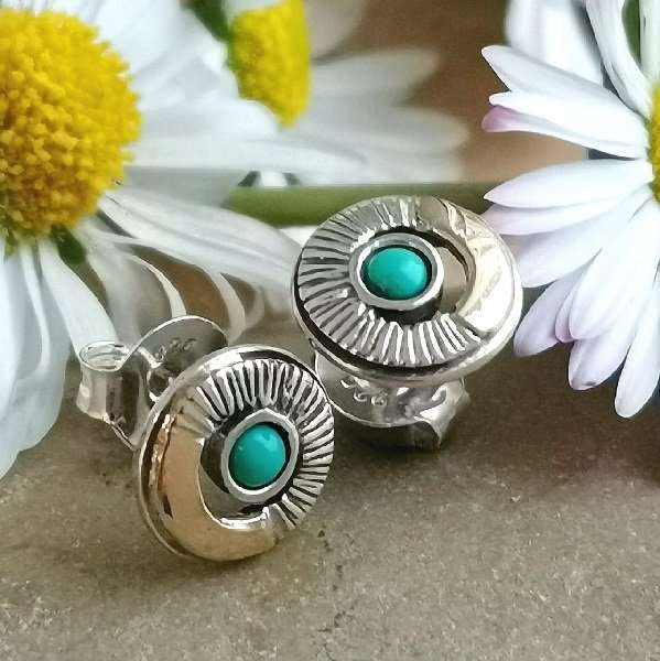 Серьги из серебра 925 пробы, вставка бирюза, золото. Размер вставки 2 мм. Диаметр художественного элемента 8 мм. Длина штифта 10 мм. Средний вес изделия 1,2 гр. Производство Израиль.