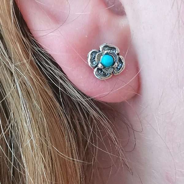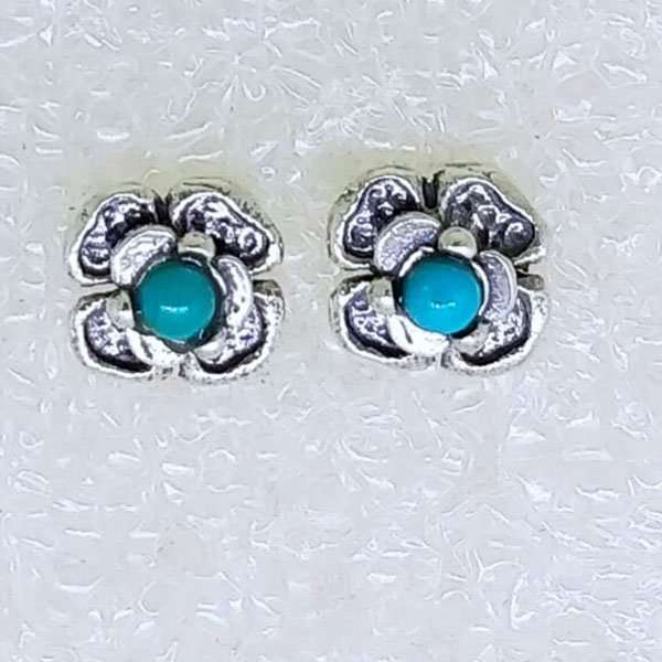 Серьги из серебра 925 пробы, вставка бирюза. Размер вставки 3 мм. Диаметр художественного элемента _8 мм. Длина штифта 10 мм. Средний вес изделия 1 гр. Производство Израиль.