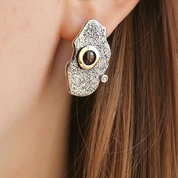Серьги из серебра 925 пробы, вставка гранат, куб.циркон, пластина из золота. Диаметр вставок гранат 5 мм и 2 мм. Длина серег 26 мм. Размер художественного элемента 26х15 мм. Средний вес изделия 9,41 гр. Производство Израиль.