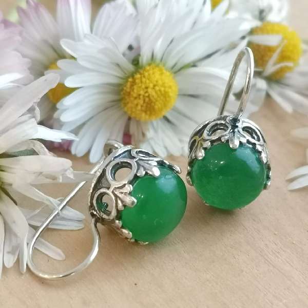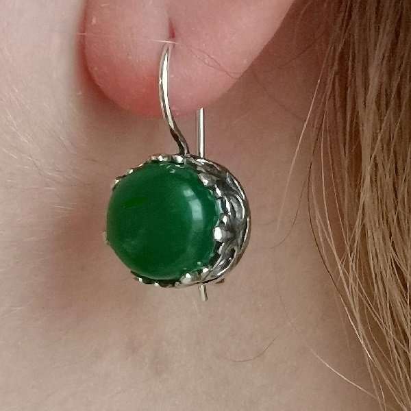 Серьги из серебра 925 пробы, вставка изумрудный халцедон. Размер вставки 10 мм. Длина серег с дужкой 22 мм. Средний вес изделия 6.6 гр. Производство Израиль.