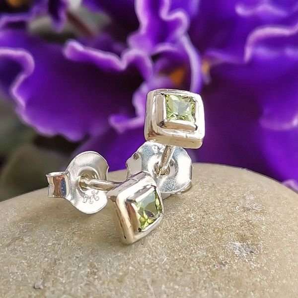 Серьги из серебра 925 пробы, вставка хризолит. Размер вставки 3х3 мм. Диаметр художественного элемента 5х5 мм. Длина штифта 10 мм. Средний вес изделия 1,5 гр. Производство Израиль.