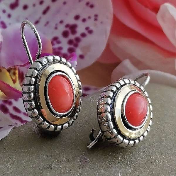 Серьги из серебра 925 пробы, вставка коралл, пластина из золота. Размер вставки 8х6 мм. Размер художественного элемента 17х14 мм. Длина серег 28 мм. Средний вес изделия 7,86гр. Производство Израиль.