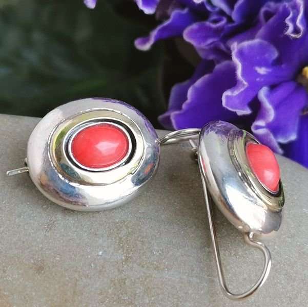 Серьги из серебра 925 пробы, вставка коралл, пластина из золота. Размер вставки: 8х6 мм. Размер художественной части 20х17 мм. Длина серег с дужкой 28 мм .Средний вес изделия 8,8 гр. Производство Израиль.