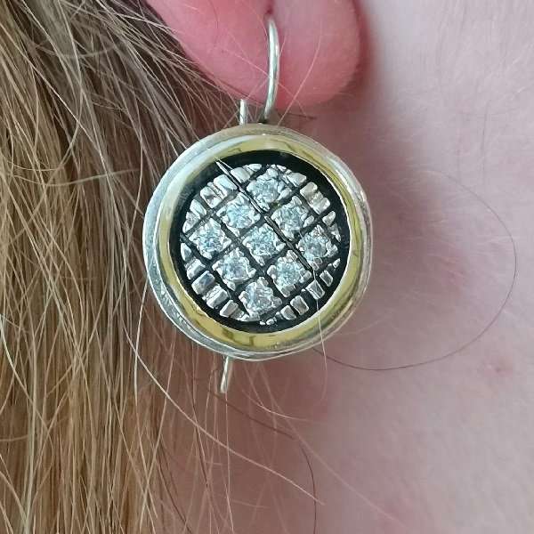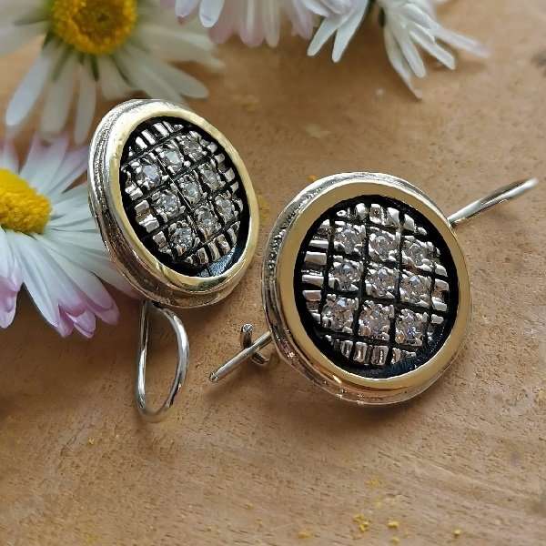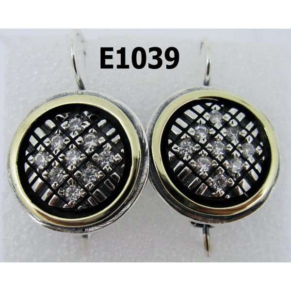 Серьги из серебра 925 пробы, вставки: кубический циркон 2 мм, золотая пластина. Длина серег с дужкой 30 мм. Диаметр художественного элемента 18 мм. Средний вес изделия 7,4 гр. Производство Израиль.