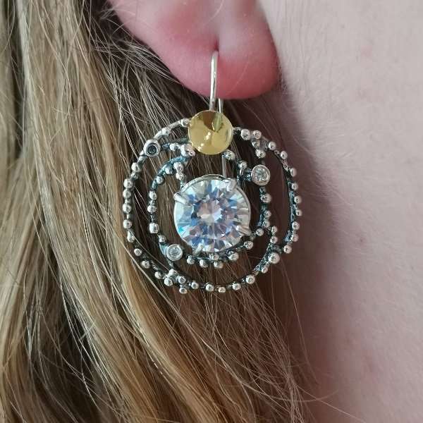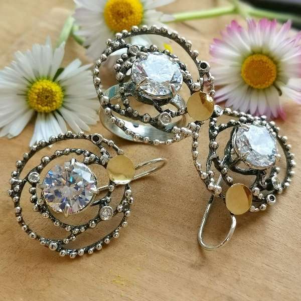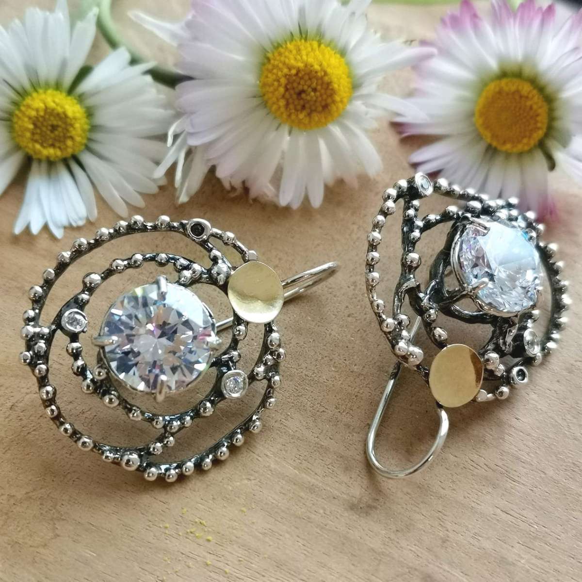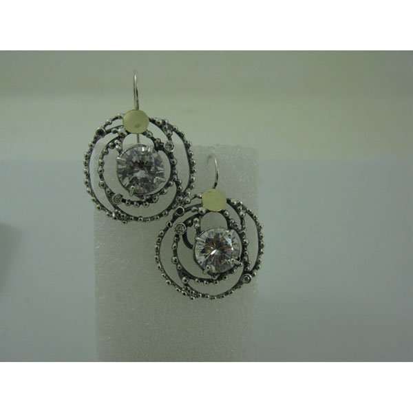 Серьги из серебра 925 пробы, вставки: кубический циркон 10 мм и 2 мм, золотая пластина. Длина серег с дужкой 35 мм. Диаметр художественного элемента 30 мм. Средний вес изделия 11,2 гр. Производство Израиль.