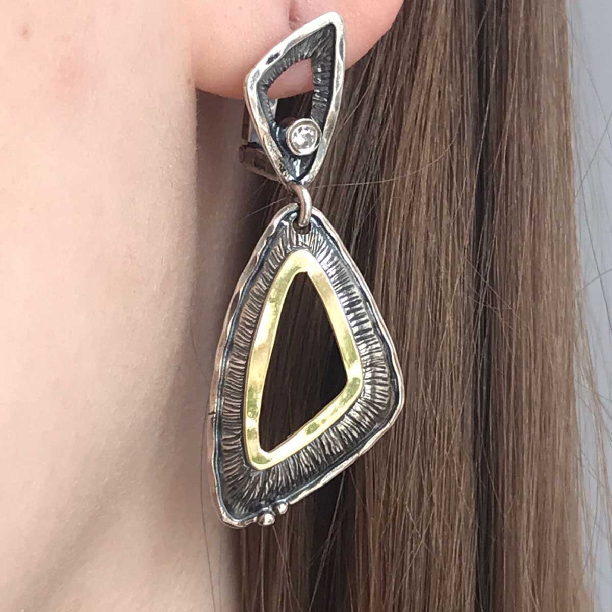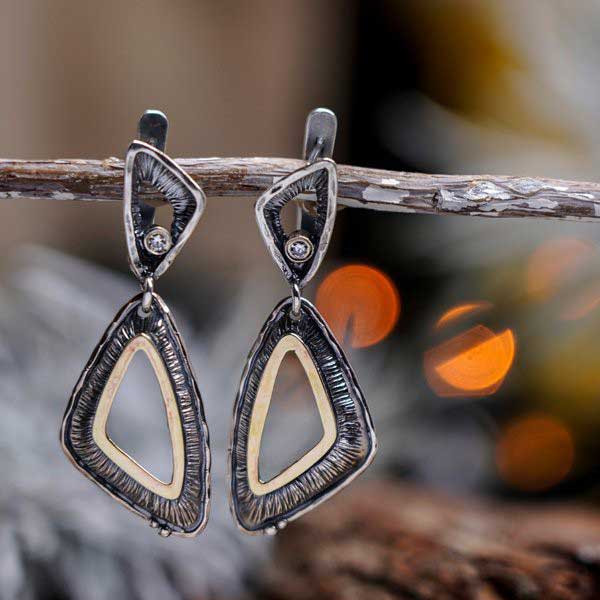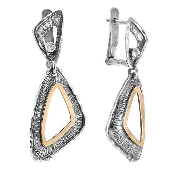 Серьги из серебра 925 пробы, вставка куб.циркон 2,5 мм, пластина из золота. Ширина 19мм. Длина серег 40мм. Средний вес изделия 6,5гр. Производство Израиль.