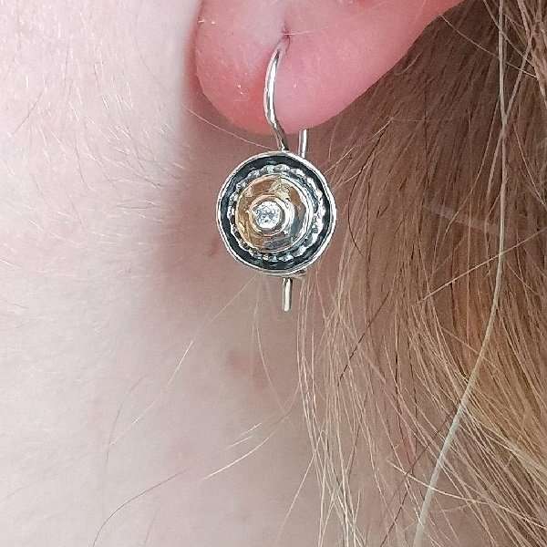 Серьги из серебра 925 пробы, вставки: кубический циркон 3 мм, золотая пластина. Длина серег с дужкой 20 мм, диаметр художественного элемента 10 мм. Средний вес изделия 2,8 гр. Производство Израиль.