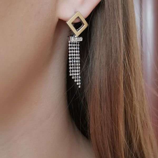 Серьги из серебра 925 пробы, вставки: кубический циркон 1 мм, золотая пластина. Длина серег 45 мм. Размер художественного элемента 15х15 мм. Средний вес изделия 7 гр. Производство Израиль.