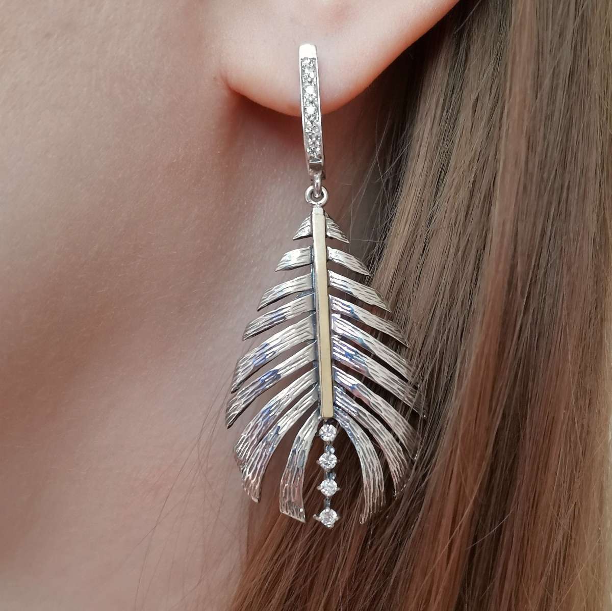 Серьги из серебра 925 пробы, вставка куб.циркон, пластина из золота. Размер вставок 2 и 1 мм. Размер художественного элемента 40х25 мм. Длина серег 55 мм. Средний вес изделия 12,27 гр. Производство Израиль.