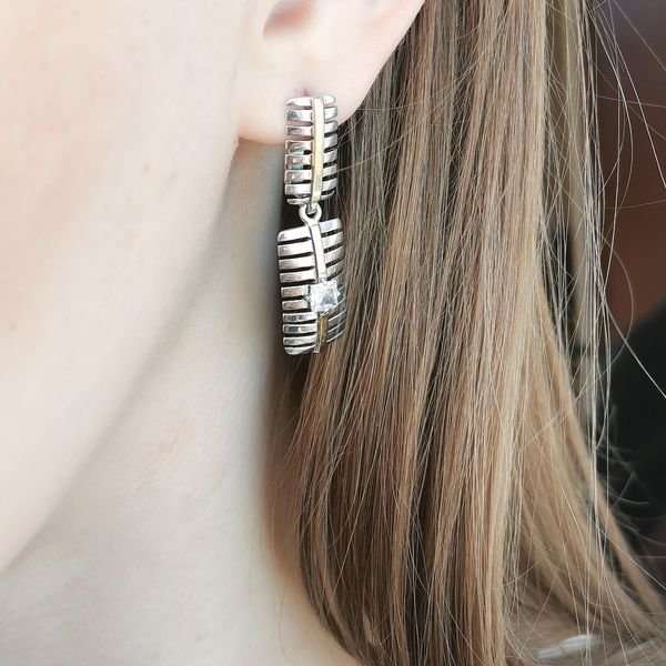 Серьги из серебра 925 пробы, вставки: кубический циркон, золотая пластина. Размер вставки 4х4 мм. Длина серег 40 мм. Размер верхнего художественного элемента 15х8 мм, нижнего 20х10 мм. Средний вес изделия 5,72 гр. Производство Израиль.