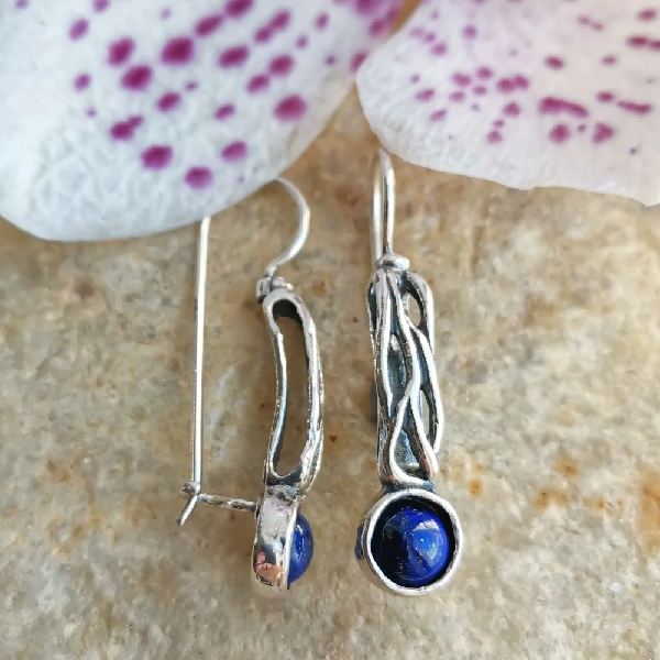 Серьги из серебра 925 пробы, вставка лазурит. Диаметр вставок 6 мм. Длина серег с дужкой 35 мм. Размер художественного элемента 25х8 мм. Средний вес изделия 4.8 гр. Производство Израиль.
