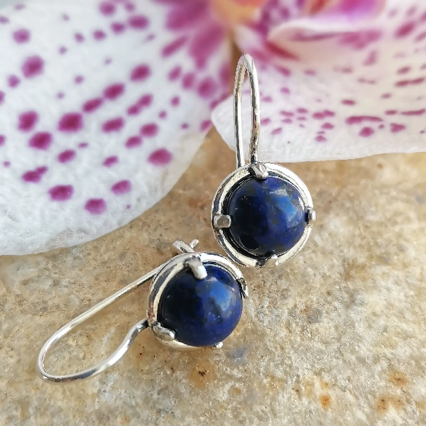 Серьги из серебра 925 пробы, вставка лазурит. Диаметр вставки 8 мм. Длина серег с дужкой 20 мм. Средний вес изделия 4.3 гр. Производство Израиль.