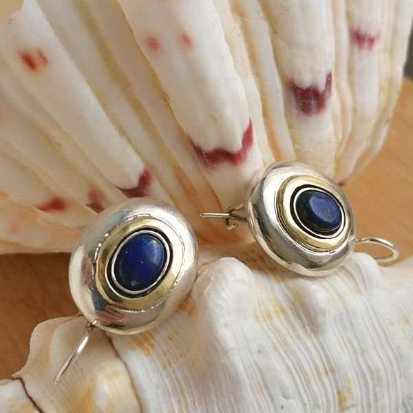 Серьги из серебра 925 пробы, вставка лазурит, пластина из золота. Размер вставки: 8х6 мм. Размер художественной части 20х17 мм. Длина серег с дужкой 28 мм .Средний вес изделия 8,8 гр. Производство Израиль.
