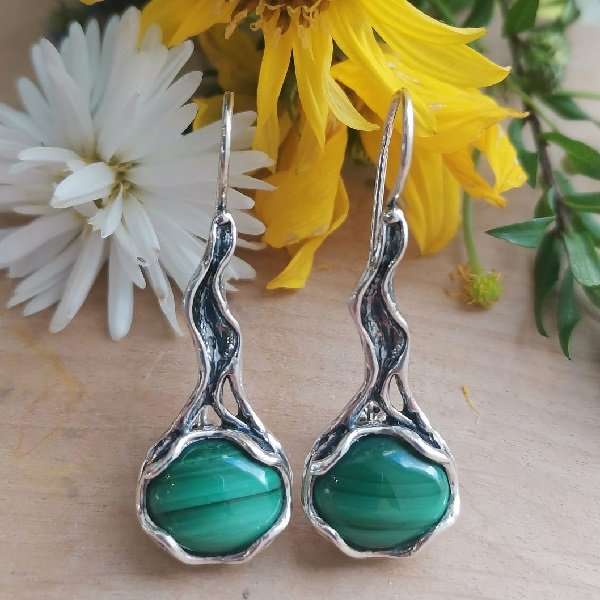 Серьги из серебра 925 пробы, вставка малахит. Размер вставки:овал 10 х 12 мм. Длина серег 4 см. Средний вес изделия 6,9 гр. Производство Израиль.