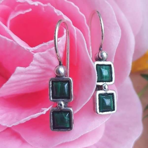 Серьги из серебра 925 пробы, вставка малахит. Размер вставки 4х4 мм. Длина серег 25 мм. Средний вес изделия 3,3 гр. Производство Израиль.