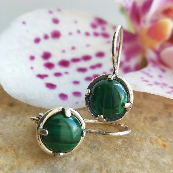 Серьги из серебра 925 пробы, вставка малахит. Диаметр вставки 8 мм. Длина серег с дужкой 20 мм. Средний вес изделия 4.3 гр. Производство Израиль.