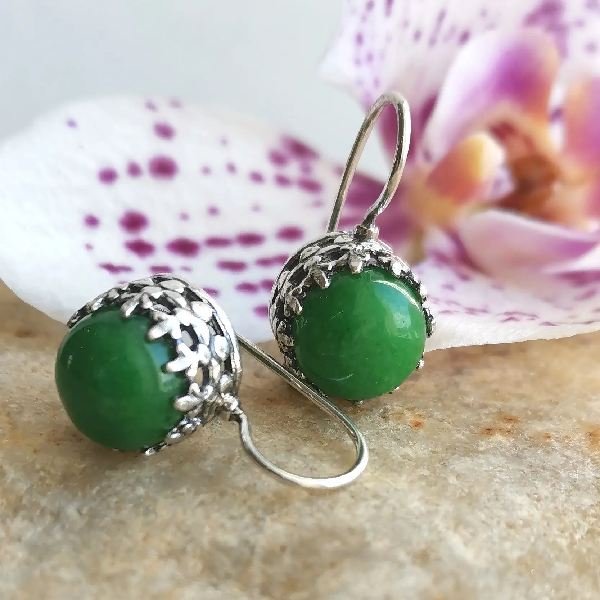Серьги из серебра 925 пробы, вставка нефрит. Диаметр вставки 10 мм. Длина серег с дужкой 25 мм. Средний вес изделия 6,3 гр. Производство Израиль.