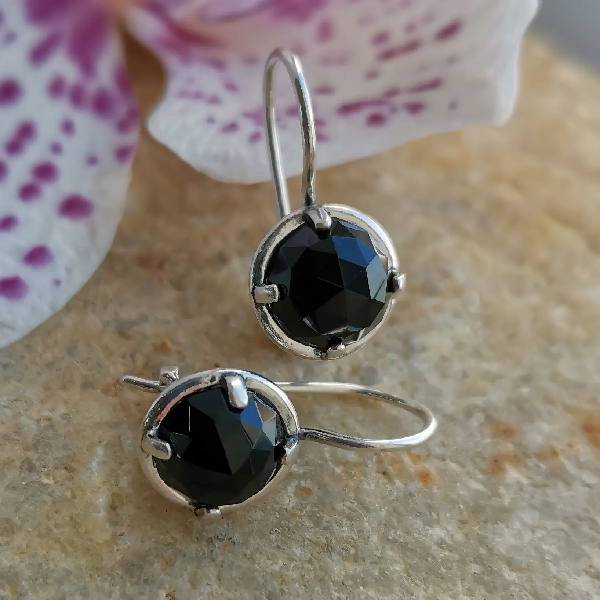 Серьги из серебра 925 пробы, вставка граненый оникс. Диаметр вставки 8 мм. Длина серег с дужкой 20 мм. Средний вес изделия 4.3 гр. Производство Израиль.