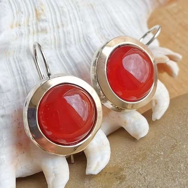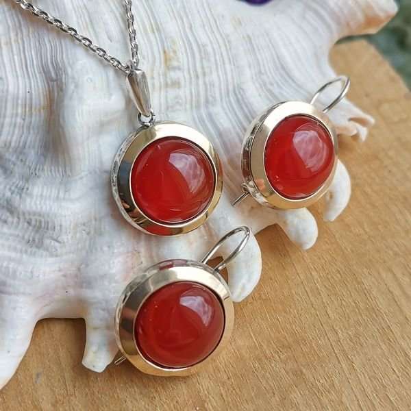 Серьги из серебра 925 пробы, вставка сердолик, пластина из золота. Диаметр вставки 14 мм. Диаметр художественной части 19 мм. Длина серег с дужкой 29 мм. Средний вес изделия 9,6 гр. Производство Израиль.