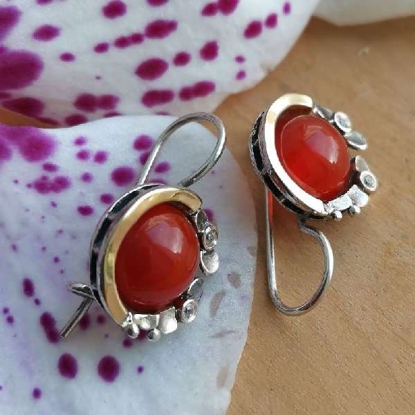 Серьги из серебра 925 пробы, вставка сердолик, куб.циркон, пластина из золота. Диаметр вставок: бирюза 10 мм, куб.циркон 1,5 мм. Длина серег с дужкой 25 мм. Диаметр художественного элемента 14 мм. Средний вес изделия 5,0 гр. Производство Израиль.