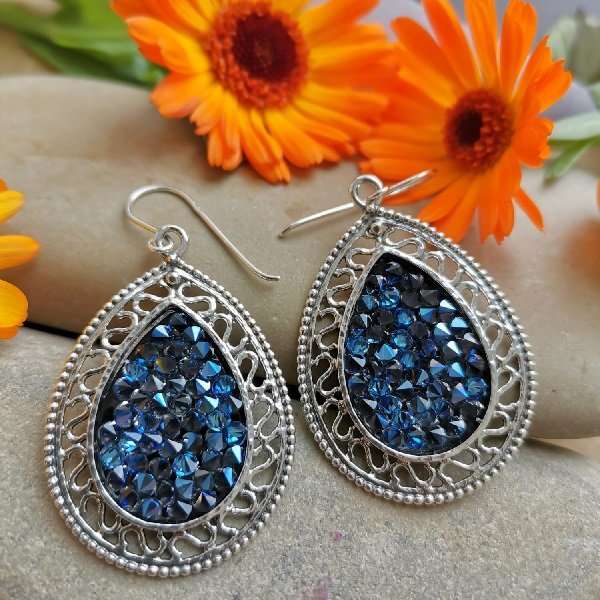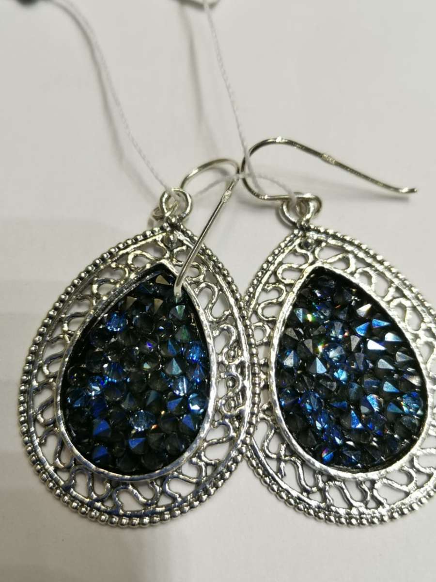 Серьги из серебра 925 пробы, вставка Кристалл Сваровски (цвет синий). Размер вставки 16 х 23 мм. Длина серег 52 мм. Размер художественного элемента 28 х 40 мм. Средний вес изделия 14,4 гр. Производство Израиль.