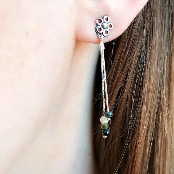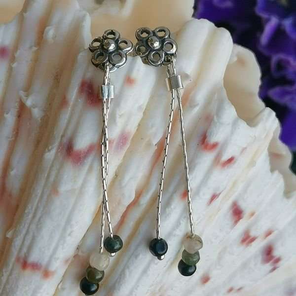Серьги-пусеты из серебра 925 пробы, вставка турмалин 3 мм. Длина серег 45 мм. Диаметр художественного элемента 7 мм. Средний вес изделия 1,4 гр. Производство Израиль.