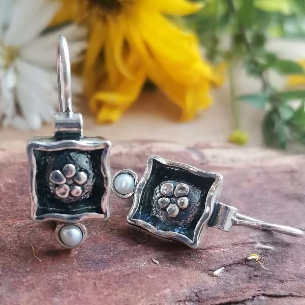 Серьги из серебра 925 пробы, вставка жемчуг. Диаметр вставок 3 мм.. Размер художественного элемента 18х11 мм. Длина серег с дужкой 25 мм. Средний вес изделия 4,4 гр. Производство Израиль.