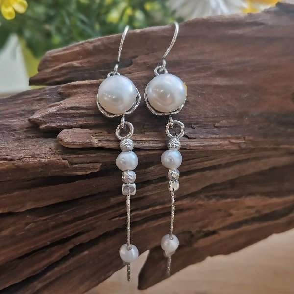 Серьги из серебра 925 пробы, вставка жемчуг. Диаметр вставок 8 мм и 4 мм. Длина серег с петлёй 65 мм. Средний вес изделия 4.5 гр. Производство Израиль.