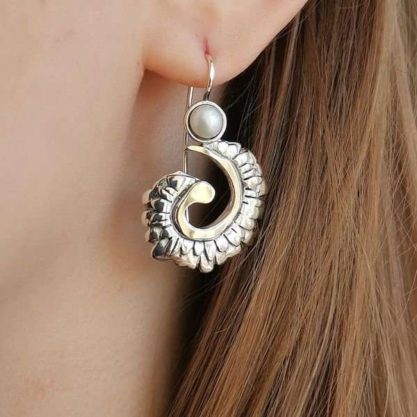 Серьги из серебра 925 пробы, вставки: золотая пластина, жемчуг. Диаметр вставки 5 мм. Длина серег с дужкой 36 мм, Размер художественного элемента 27х21 мм. Средний вес изделия 8,46 гр. Производство Израиль.