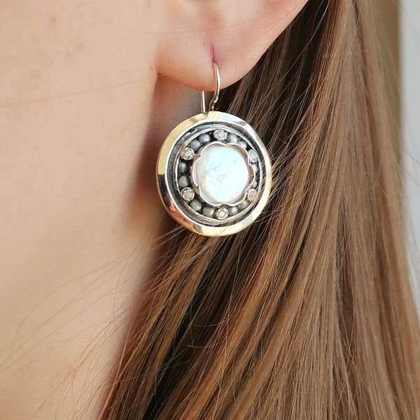 Серьги из серебра 925 пробы, вставки: золотая пластина, жемчуг, куб. циркон. Диаметр вставки из жемчуга 10 мм, 2 мм, из куб циркона 1,5 мм Длина серег с дужкой 30 мм, диаметр художественного элемента 20 мм. Средний вес изделия 10,82 гр. Производство Израиль.