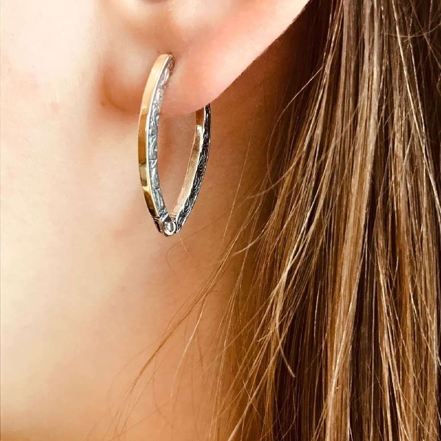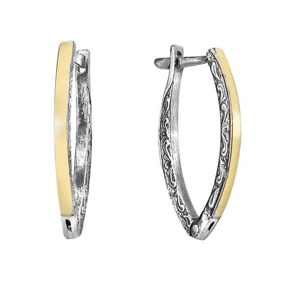 Серьги из серебра 925 пробы, вставка: золотая пластина. Длина серег 25 мм, Ширина дуги 2 мм. Средний вес изделия 3,3 гр. Производство Израиль.