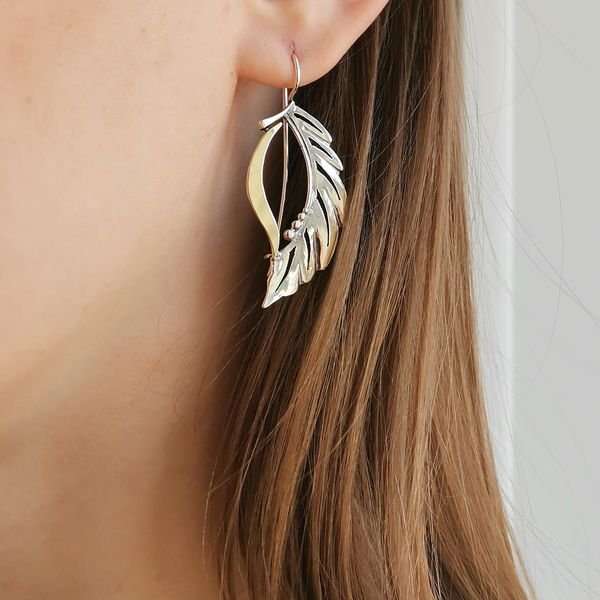 Серьги из серебра 925 пробы, вставка золотая пластина. Длина серег с дужкой 45 мм. Резмер художественного элемента 36х20 мм. Средний вес изделия 4,67 гр. Производство Израиль.