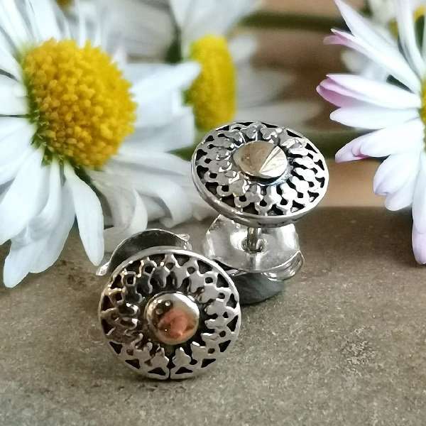 Серьги из серебра 925 пробы, вставка золото 4 мм. Диаметр художественного элемента 9 мм. Длина штифта 10 мм. Средний вес изделия 1,29 гр. Производство Израиль.