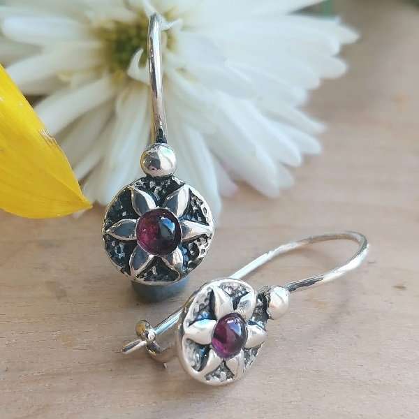 Серьги из серебра 925 пробы, вставка гранат. Диаметр вставки 3 мм. Длина серег с дужкой 20 мм. Размер художественного элемента 10х8 мм. Средний вес изделия 2,1 гр. Производство Израиль.