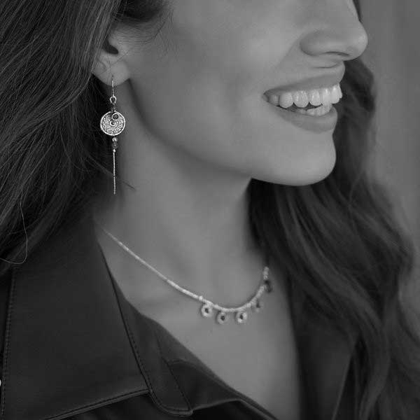 Серьги из серебра 925 пробы, вставка лабрадор. Диаметр вставок 3 мм и 4 мм. Диаметры обруча 13 мм, круга 15 мм. Длина серег с петлей 80 мм. Средний вес изделия 5,4 гр. Производство Израиль.Потрясающей красоты серьги с двухъярусной подвеской, на петле-замке. Первый ярус, в виде обруча, украшен вставкой из лабрадора. Второй, круглый, щедро покрыт чернёным орнаментом в Израильском стиле. Изящная цепочка - подвеска тоже украшена вставкой из лабрадора. Изумительное украшение, которое почла бы за честь носить даже самая капризная модница.