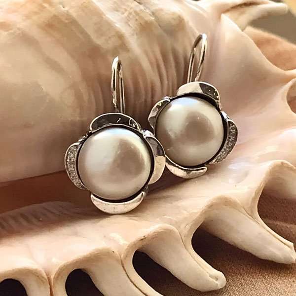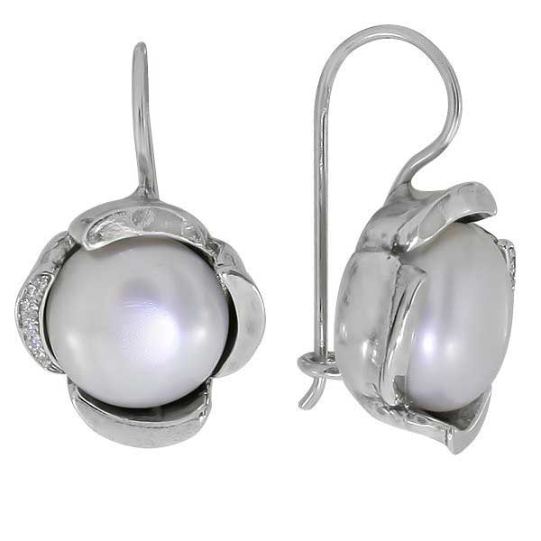 Серьги из серебра 925 пробы, вставка жемчуг, куб.циркон. Диаметр жемчуга 12 мм, куб.циркона 1мм. Длина серег 25 мм. Диаметр художественного элемента 15 мм. Средний вес изделия 10,5 гр. Производство Израиль.